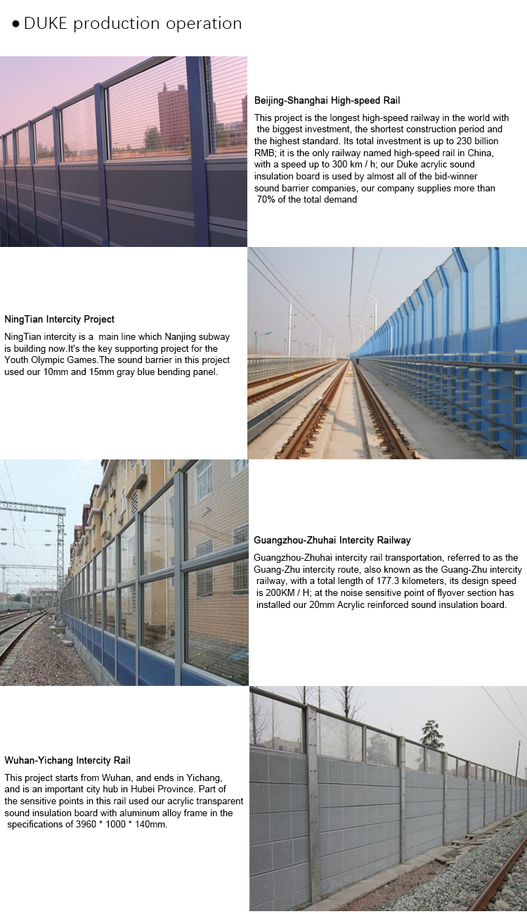 2. DUKE Sound insulation of this acrylic sheet can achieve 30db(A). It can fully meet the requirements of the sound barrier, and has high transmittance, resistance to yellowing, and a good landscape effect. But the problem is: thicker plate prices are more expensive and impact resistance worse than the pc board. Sound barrier sheets are used in many domestic projects, with height 3.65m, can reduce 6-7db. At present, mass production of transparent acrylic sheet of 8-20mm thick has been realized in China. By means of reinforcement in the plate, the impact resistance is also improved. There are more and more countries use acrylic stiffener to build sound barrier.